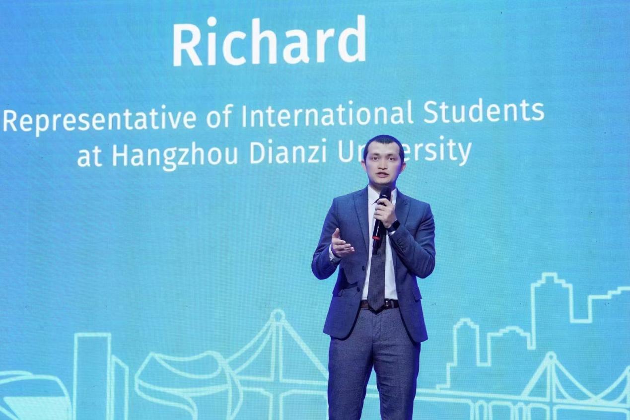 在大会上,Richard上台分享了他与杭电、与亚运、与钱塘区的故事,表达了对母校和钱塘区的热爱和致力于帮助更多国际友人了解钱塘、了解中国的志向。